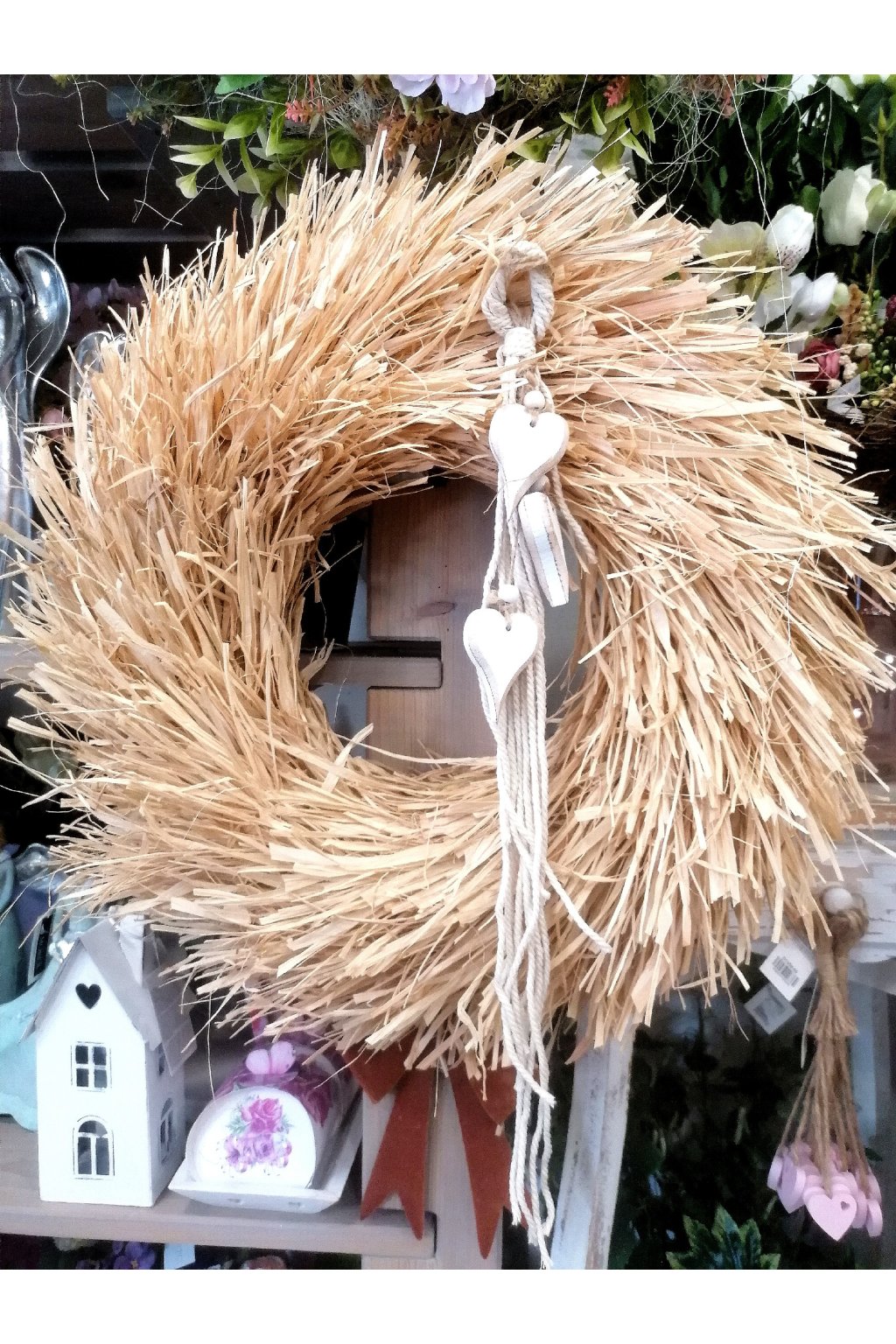 Přírodní věnec vázaný z lýka, doplněný dřevěnými srdíčky.